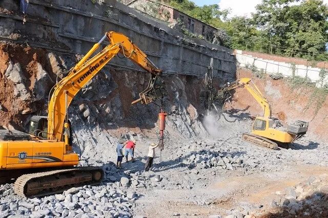 一台恒日液压钻机 + 一台30吨炮锤,一天大约可打100立方岩石,产量是直接使用炮锤打的5倍以上。